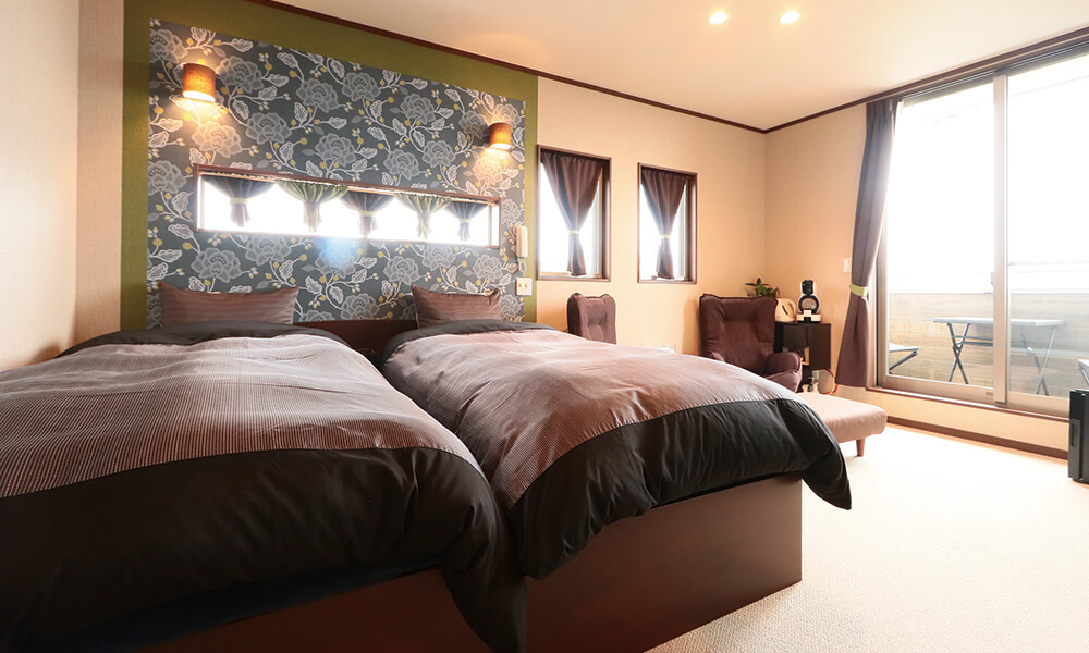 Auberge Suehiro(オーベルジュ スエヒロ)の客室は全2室。バストイレ、バルコニーが付いたとっておきのお部屋です。いずれも海景色を望むオーシャンビュー洋室ツインルームになります。